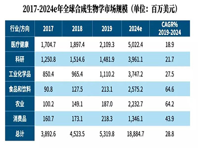 據(jù)CB Insights數(shù)據(jù)顯示,2019年全球合成生物學(xué)市場(chǎng)規(guī)模達(dá)53億美元,預(yù)計(jì)到 2024年全球市場(chǎng)規(guī)模將達(dá)到189億美元。2019-2024年期間,合成生物學(xué)市場(chǎng)年復(fù)合增速將達(dá)到28.8%,這是多方因素聯(lián)合推動(dòng)的結(jié)果。